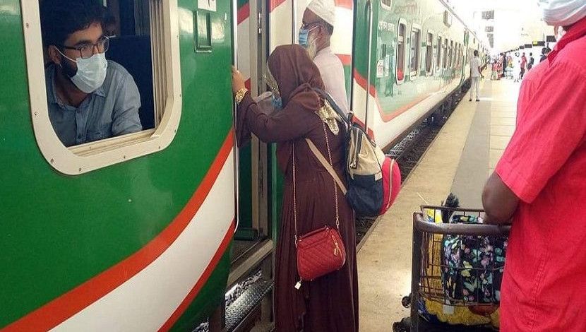 বাড়ি যেতে রেলে উঠছেন এক নারী যাত্রী। কমলাপুর রেল স...