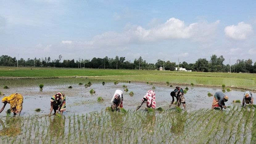 ধানের চারা রোপণে ব্যস্ত সময় পার করছেন নারী শ্রমিকে...