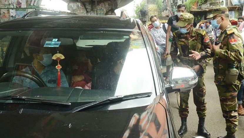 কঠোর লকডাউনের পঞ্চম দিনে রাজধানীর ওয়ারিতে সেনাবাহি...