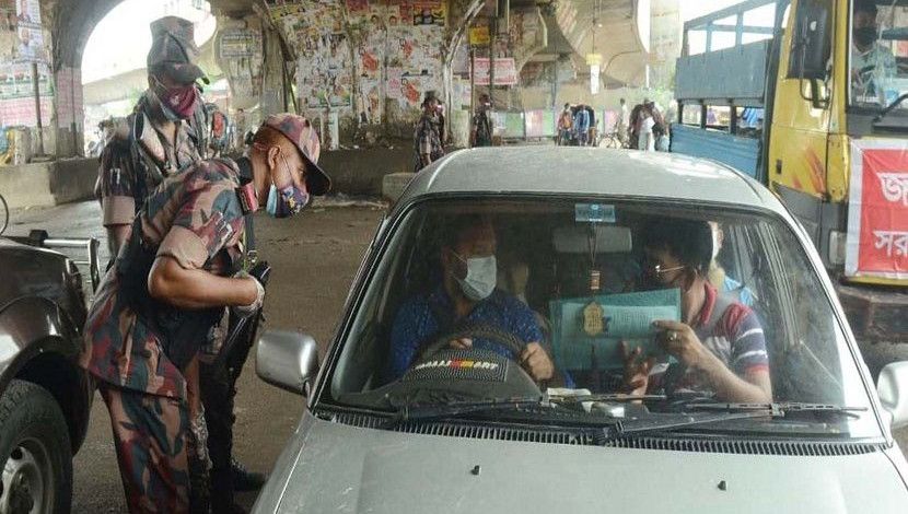 লকডাউনের ষষ্ঠদিনে রাজধানীতে পুলিশের চেকপোস্ট। ছবি-...
